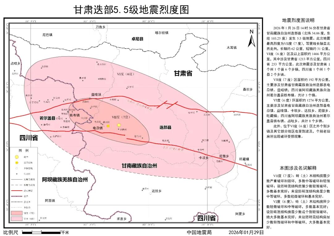 2026年1月26日14时56分,在甘肃省甘南州迭部县发生5.5级地震。地震发生后,中国地震局派出地震现场工作队,依照《地震现场工作:调查规范》(GB/T 18208.3-2011)、《中国地震烈度表》(GB/T 17742-2020)、《地震烈度现场评定》(DB/T 107-2025),对灾区141个调查点展开了实地震害调查,并充分参考震区断裂构造、仪器烈度、余震分布、震源机制等科技支撑成果,确定了此次地震的烈度分布,完成了《甘肃迭部5.5级地震烈度图》编制工作,现正式向社会发布。